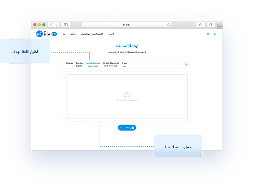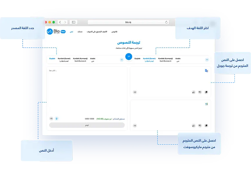 احدى ميزات بله الخاصة بترجمة النصوص، وهي متوفرة بعدة لغات مثل الإنجليزية والفرنسية والإسبانية والعربية والكردية (السورانية - الكرمانجية)، وقريبًا المزيد من اللغات الأخرى ستكون متوفرة.