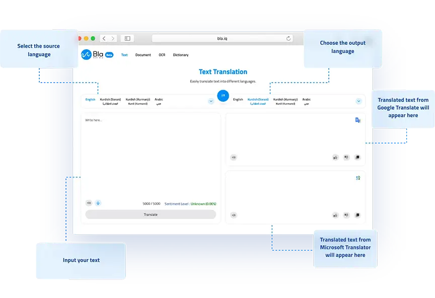 One of the features of Bla involves text translation, which is available in many different languages such as English, French, Spanish, Arabic and Kurdish (Sorani -Kurmanji), and in the future many other languages will also be available.